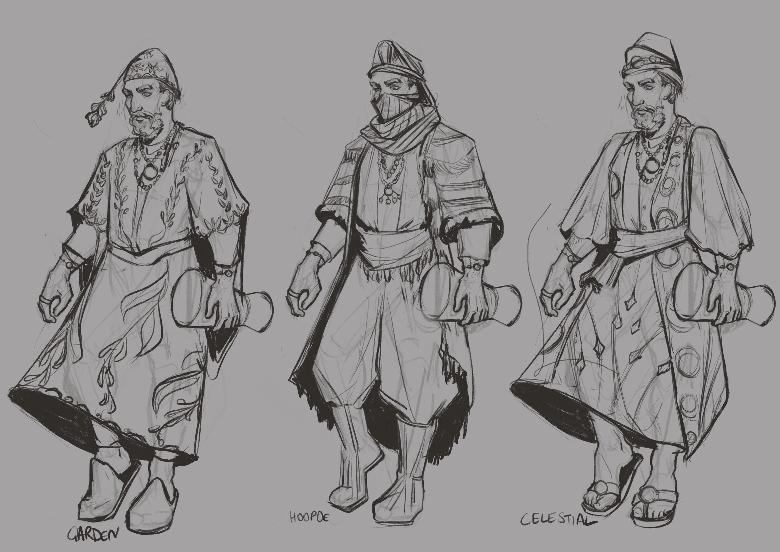 Some costume designs created for the Sufi class for Zairoo, a Pan-African RPG project.